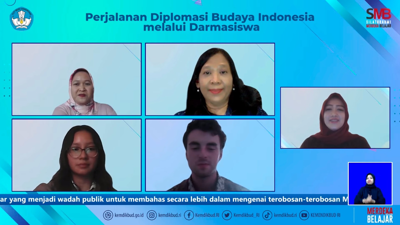 Dalam webinar tersebut hadir pula tiga narasumber lain yakni Yunitasari, Koordinator Kerja Sama Luar Negeri Kemendikbudristek; Erni C. Westi, Pengelola dan Pengajar Program Darmasiswa dari Universitas Indonesia; Alisia Rosari Arnold asal Jerman yang mengambil studi Seni Tari di Institut Seni Indonesia Padangpanjang; dan Nathan James Scarpa asal Amerika Serikat yang belajar Bahasa Indonesia di Universitas Syiah Kuala.
