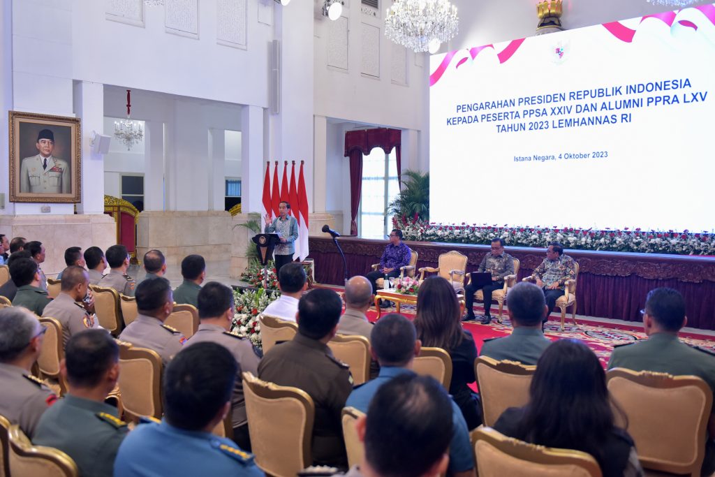 Hal tersebut disampaikan Presiden dalam pengarahannya kepada peserta Program Pendidikan Singkat Angkatan (PPSA) XXIV dan alumni Program Pendidikan Reguler Angkatan (PPRA) LXV Tahun 2023 Lembaga Ketahanan Nasional (Lemhannas), Rabu (04/10/2023), di Istana Negara, Jakarta.