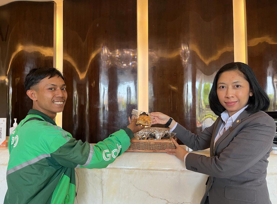 Hotel yang terletak di kawasan elit Ciputra World Surabaya ini, membagikan beraneka macam makanan dalam ukuran compact untuk para ojek online yang datang.