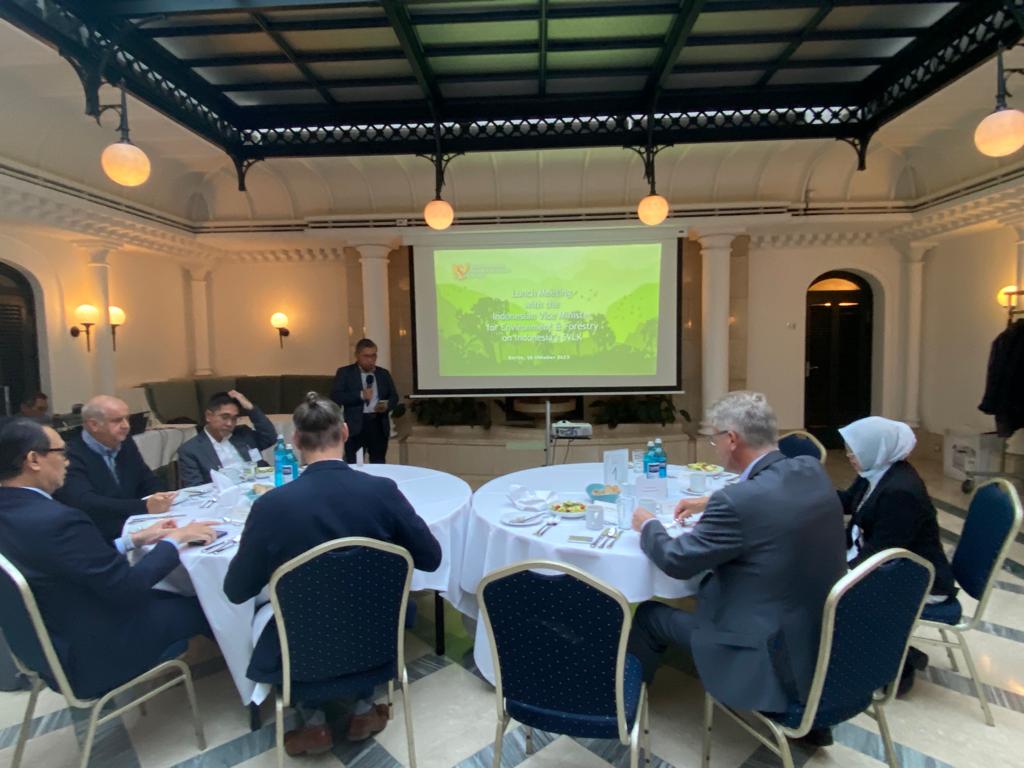 Dalam pertemuan yang digelar di The Westin Grand Hotel, Berlin, Jerman, Senin (16/10/2023). Wakil Menteri Alue Dohong berbicara di depan asosiasi perdagangan kayu Jerman (GD Holz), Import Promotion Desk (IPD), dan Federal Consumer Protection Agency (Verbraucherzentrale) Pemerintah Federal Jerman dalam sebuah konsep lunch meeting discussion yang inovatif.