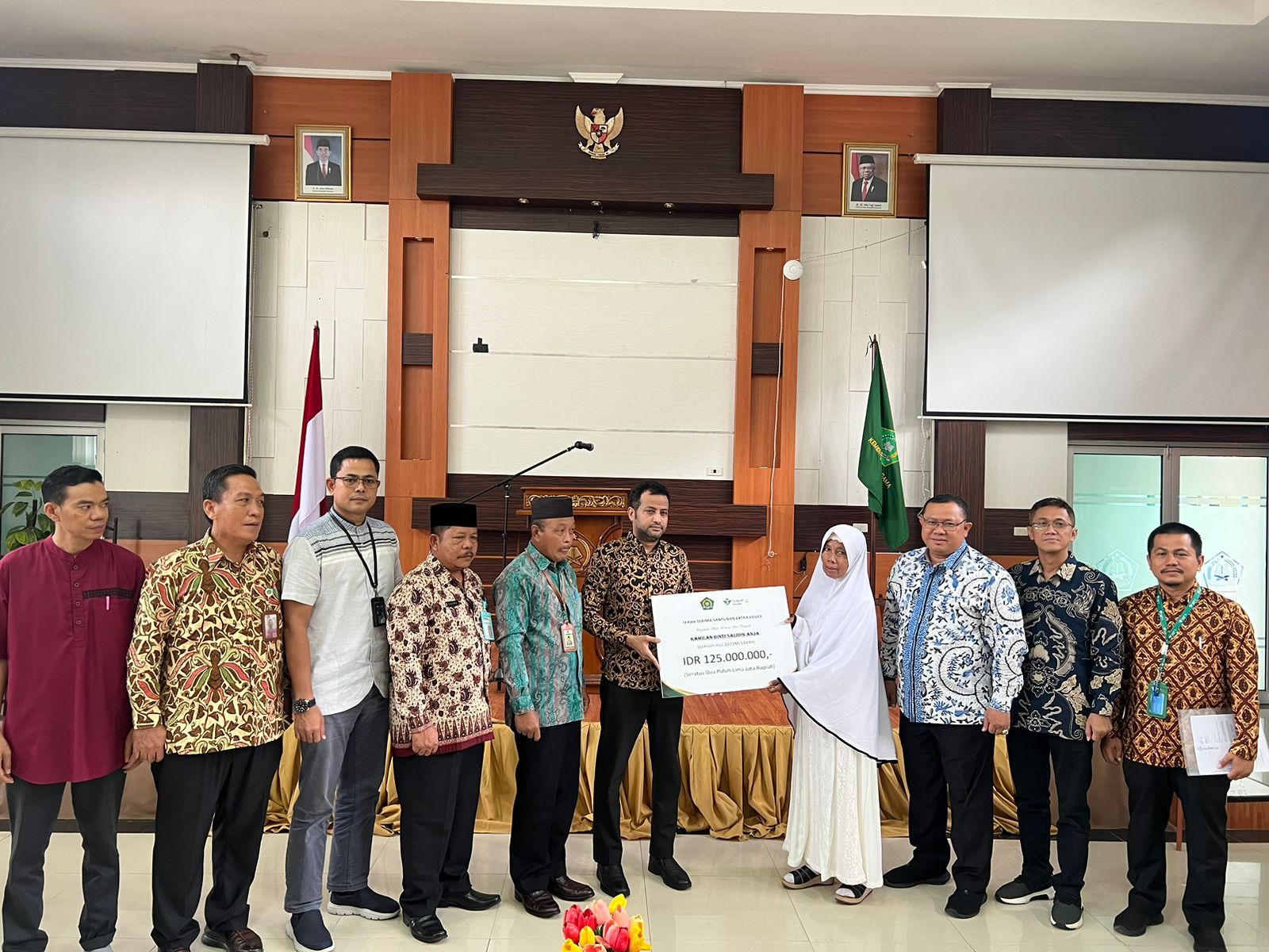 Santunan ekstra cover ini diberikan oleh Saudia Airlines dan diserahkan oleh Country Manager Saudia Airlines, Faisal Alallah, kepada istri almarhum dan kedua anak kandungnya di Aula Kanwil Kemenag Babel, Jumat (10/11/2023). Ikut mendampingi, Direktur Pelayanan Haji Dalam Negeri Saiful Mujab dan Kakanwil Kemenag Bangka Belitung (Babel), Tumiran Ganefo beserta jajaran.