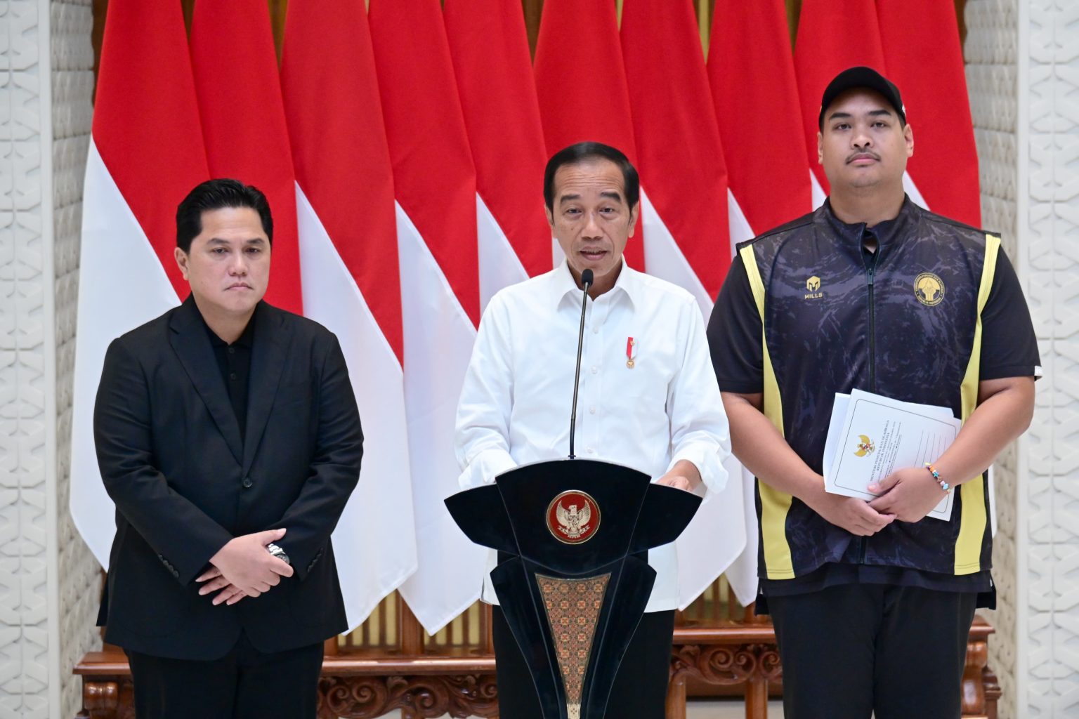 Turut mendampingi Presiden dalam keterangan pers ini Menteri Pemuda dan Olahraga (Menpora) Dito Ariotedjo serta Ketua Umum PSSI Erick Thohir.