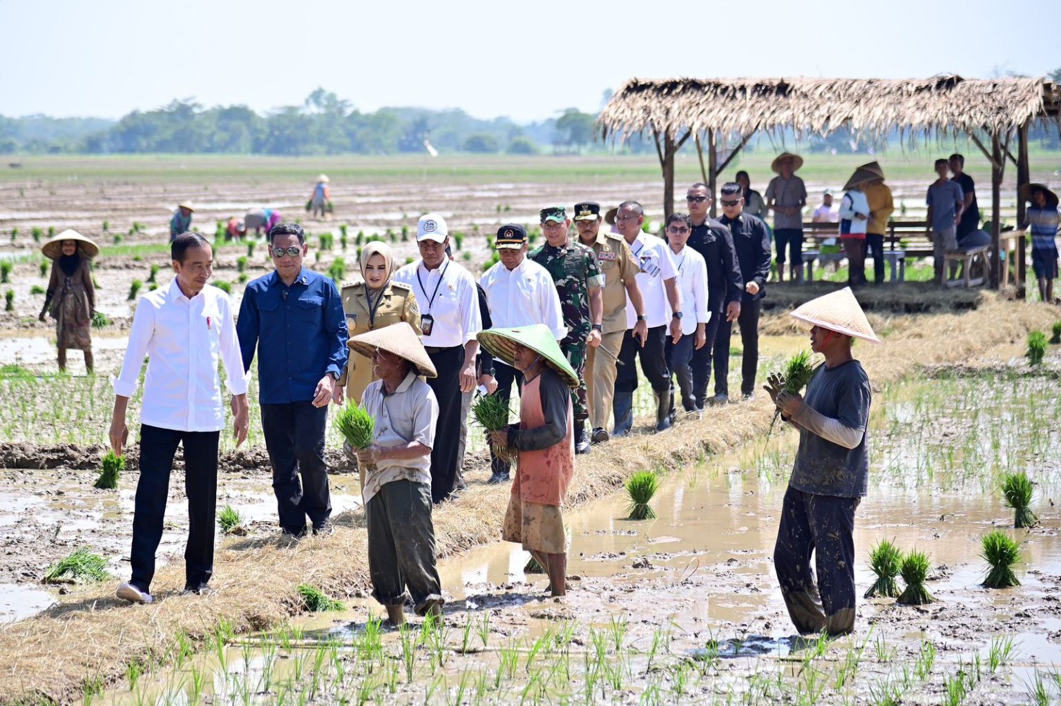 INDONESIAUPDATE.ID – Presiden RI Joko Widodo (Jokowi) meninjau penanaman padi dan menyerap aspirasi para petani di Kecamatan Kesesi, Kabupaten Pekalongan, Jawa Tengah, Rabu (13/12/2023). Dalam keterangannya usai peninjauan, Presiden Jokowi mendorong para petani agar segera memulai penanaman dikarenakan musim penghujan yang telah tiba.