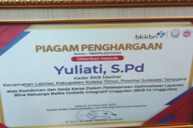 Pemberian penghargaan ini kata Kepala BKKBN Pusat, karena dukungan Pemerintah Koltim dalam hal ini Desa Keisio dan Kader BKB HIU Meohai, terhadap penyelenggaraan layanan pengasuhan dan pemantauan tumbuh kembang anak melalui kegiatan di Kelompok BKB. (Diskominfo).