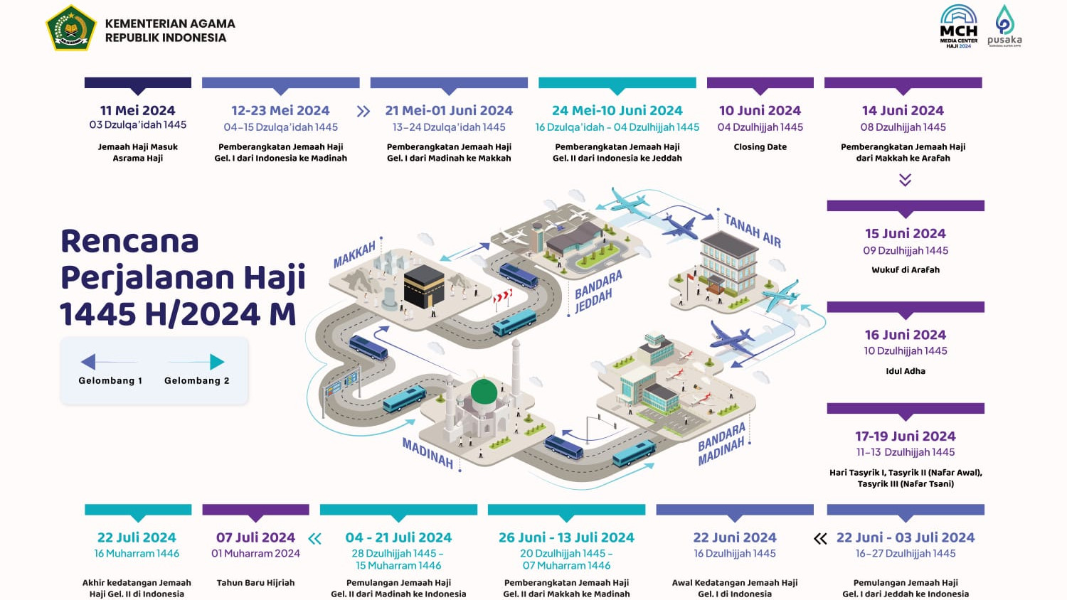 15. 16 Muharram 1446 H/22 Juli 2024, akhir kedatangan jemaah haji gelombang II di Indonesia