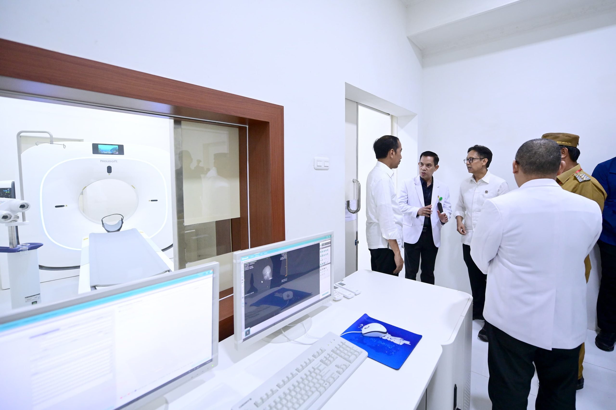 Presiden dan rombongan tiba di RSUD Mokopido sekitar pukul 15.30 WITA dan langsung meninjau fasilitas layanan BPJS Kesehatan dan fasilitas kesehatan lain seperti loket rawat inap dan CT Scan 64 slice.