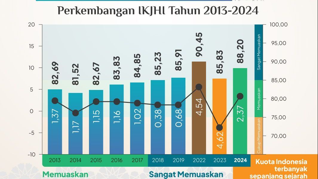 INDONESIAUPDATE.ID – Badan Pusat Statistik (BPS), Jumat lalu (20/9) mengumumkan hasil survei Indeks Kepuasan Jemaah Haji Indonesia (IKJH) 2024. Skornya sangat baik, 88,20 dari rentang 100, kategorinya sangat memuaskan. Indeks ini terbaik dalam 14 tahun penyelenggaraan haji Indonesia, kecuali 2022 (90,45).
