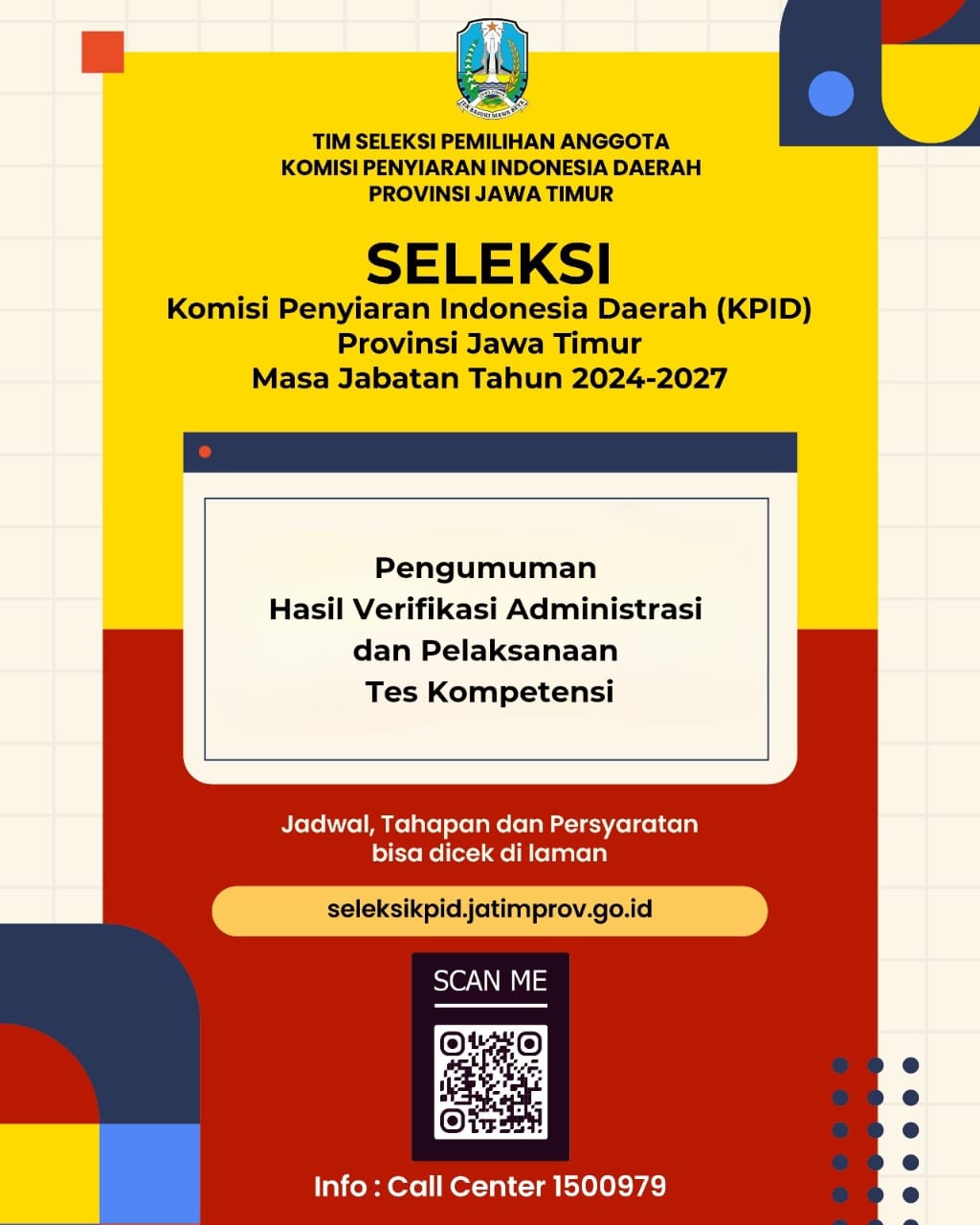 Penetapan keputusan tersebut berdasarkan Berita Acara Rapat TimselCalon Anggota KPID Jatim yang digelar 15 Oktober 2024. Selanjutnya bagi peserta yang dinyatakan lolos verifikasi dokumen administrasi, akan mengikuti tes kompetensi.