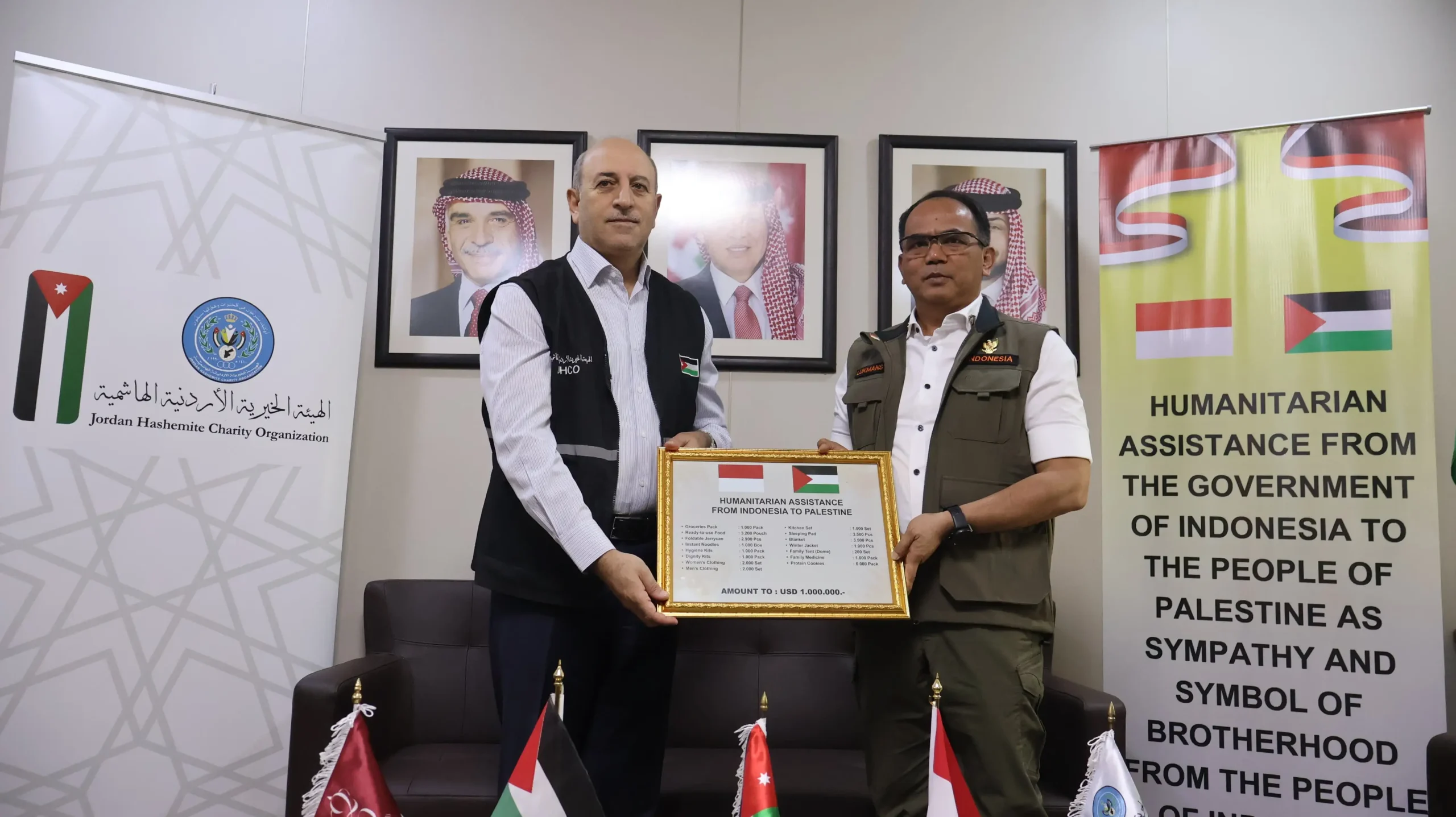 Sementara itu, serah terima bantuan secara simbolis dari Pemerintah Indonesia diwakili oleh Deputi Bidang Penanganan Darurat BNPB, Mayjen TNI Lukmansyah, M.Tr. (Han) kepada Jordanian Hashemite Charity Organization (JHCO), diwakili oleh Sekjen JHCO, Dr. Husein Al Shebli, didampingi oleh Duta Besar RI untuk Kerajaan Yordania Hasyimiah merangkap Palestina. JHCO merupakan lembaga kemanusiaan yang ditunjuk Pemerintah Yordania untuk menyalurkan bantuan dari berbagai negara ke kawasan Gaza, Palestina.