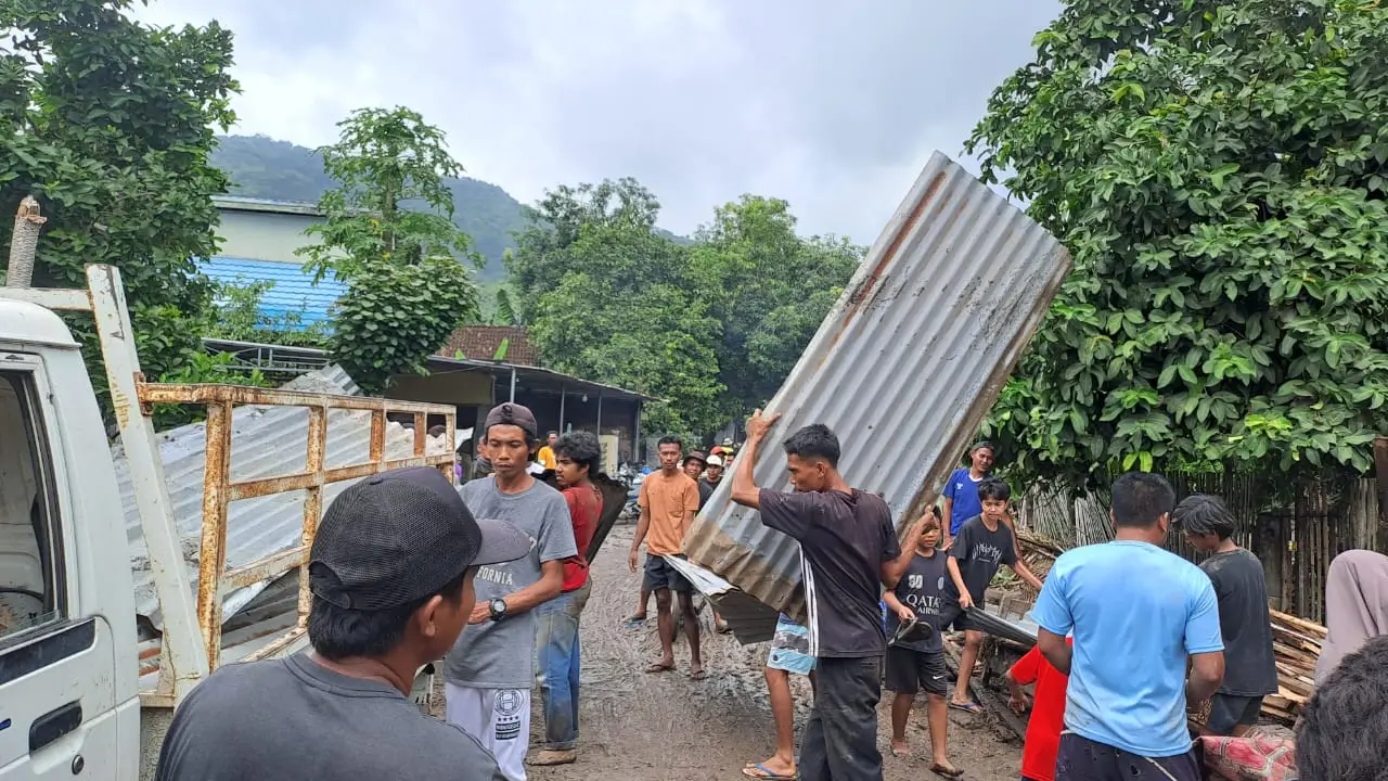 Warga bergotong royong melakukan pembersihan material lumpur yang terbawa saat banjir bandang menerjang Kabupaten Bima, Nusa Tenggara Barat, Senin (3/2). (BPBD Kabupaten Bima)