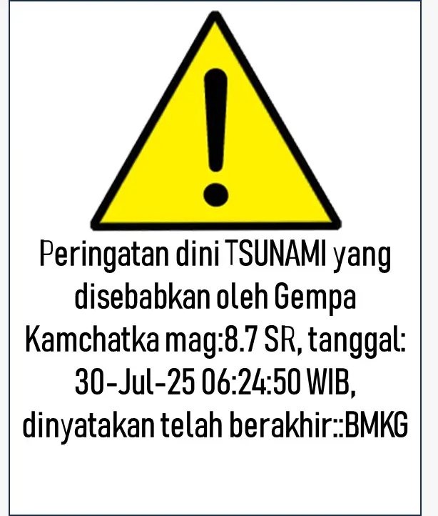 INDONESIAUPDATE.ID – Badan Meteorologi Klimatologi dan Geofisika (BMKG) mengumumkan peringatan dini tsunami di wilayah Indonesia yang disebabkan oleh gempabumi dengan magnitudo 8,7 di pesisir timur Kamchatka, Rusia pada Rabu (30/7) dinyatakan telah berakhir pada hari yang sama pukul 22.42 WIB.