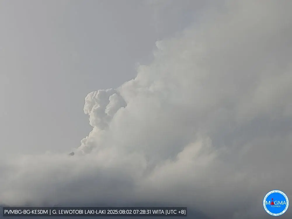 Visual Gunungapi Lewotobi laki-laki pada Sabtu 2 Agustus 2025, pukul 07:28 WITA, dari depan pos PGA Lewotobi laki-laki. (PVMBG, Badan Geologi, KESDM)