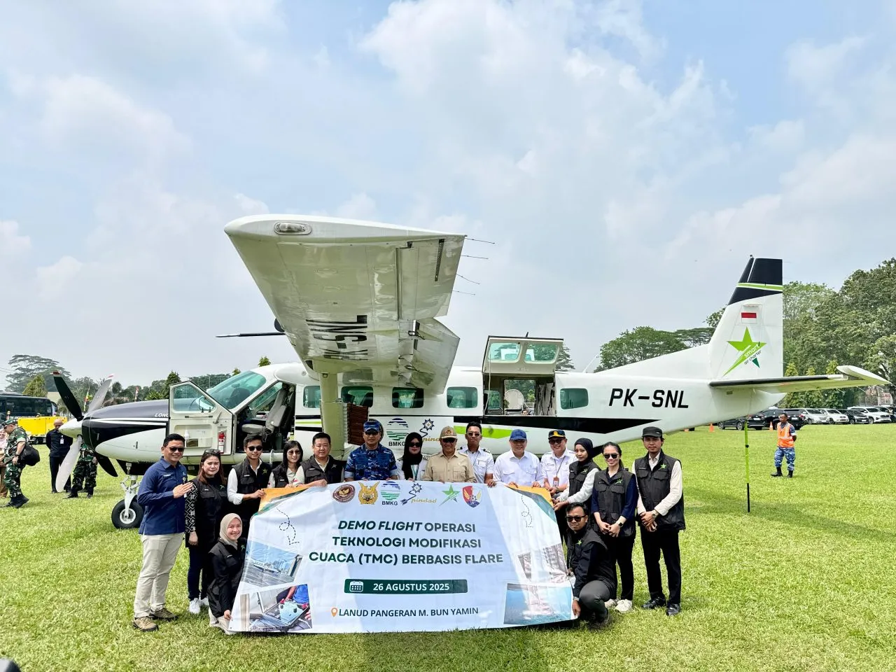 Dalam kegiatan ini digunakan pesawat Caravan PK-SNL sebagai wahana pelaksanaan penyemaian berbasis flare. Uji coba ini menjadi langkah penting dalam inovasi teknologi modifikasi cuaca nasional untuk mendukung pengelolaan sumber daya air, mitigasi bencana hidrometeorologi, serta ketahanan pangan dan energi.
