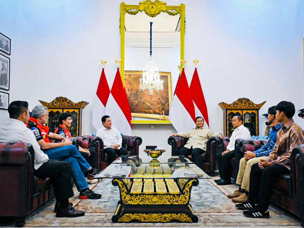 Presiden Republik Indonesia, Prabowo Subianto, menerima kunjungan juara dunia MotoGP Marc Marquez bersama dua pembalap muda Indonesia, Mario Aji dan Veda Ega Pratama, di Istana Merdeka, Jakarta, pada Selasa, 30 September 2025. (Foto: BPMI Setpres)
