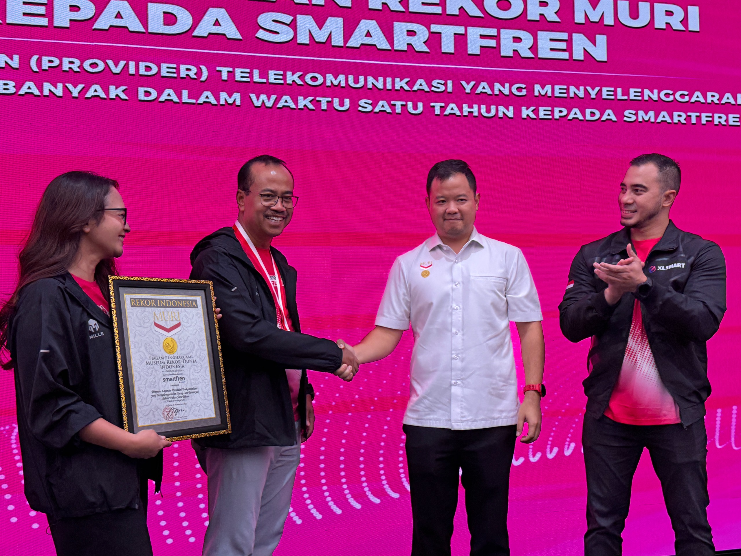 Dalam kurun satu tahun, SMARTFREN sukses menggelar rangkaian kegiatan fun run di 22 kota di seluruh Indonesia, menjangkau lebih dari 15 ribu peserta dari berbagai usia dan latar belakang. Penyerahan penghargaan dilakukan di kantor XLSMART Tower, Jakarta oleh Wakil Direktur MURI, Osmar Susilo dan diterima oleh Chief Marketing Officer SMARTFREN XLSMART, Sukaca Purwokardjono. Senin (3/11)