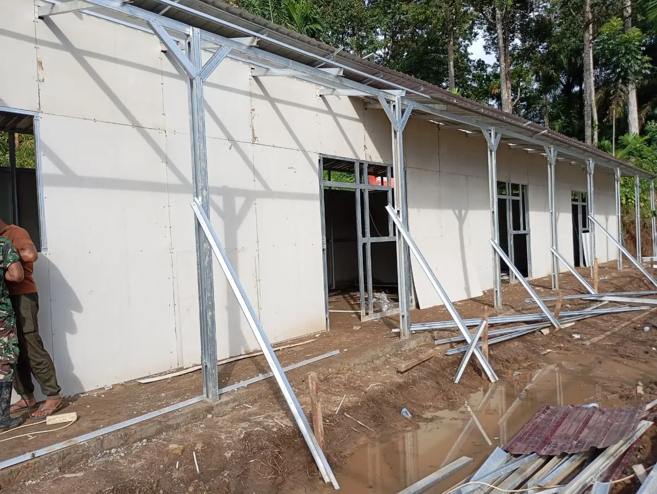 Hingga hari ini, proses pengerjaan huntara di Lapangan SDN 05 Kayu Pasak telah mencapai 50% dari target. Baja-baja ringan sebagai pondasi dan pembatas bangunan telah berdiri tegak. Pemasangan dinding mulai dilakukan bertahap. Empat unit alat berat juga terus bekerja pagi hingga malam.
